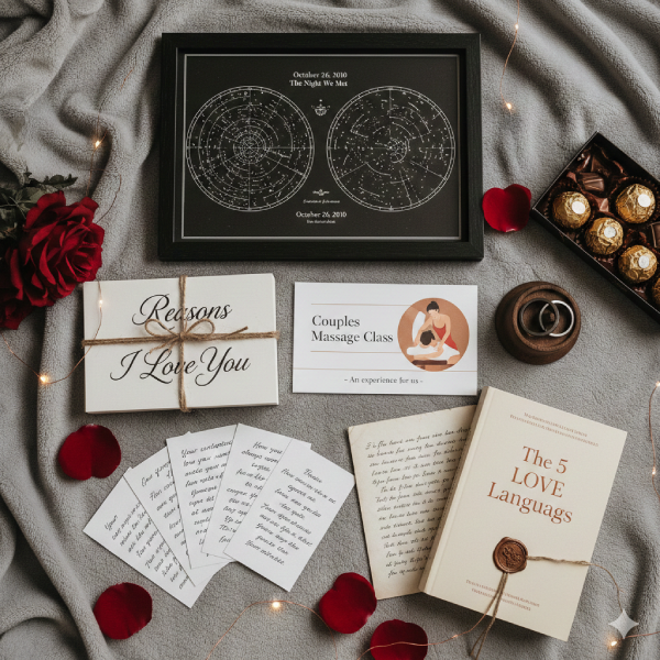 A star map of the day you met, a love-note deck, or a cozy cabin weekend just for two.