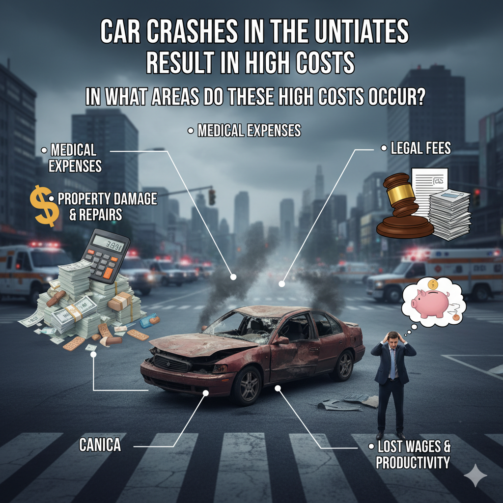Car crashes in the United States result in high costs. In what areas do these high costs occur? in many different areas: hospitals, lost paychecks, broken cars and roads, lawyers and insurance, and even traffic jams that waste gas and time. The full cost breakdown of car accidents shows that every single crash touches many lives and wallets.