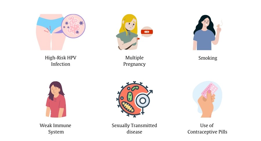 - Persistent HPV infection, smoking, weakened immunity, and chronic illnesses like diabetes can increase the risk.