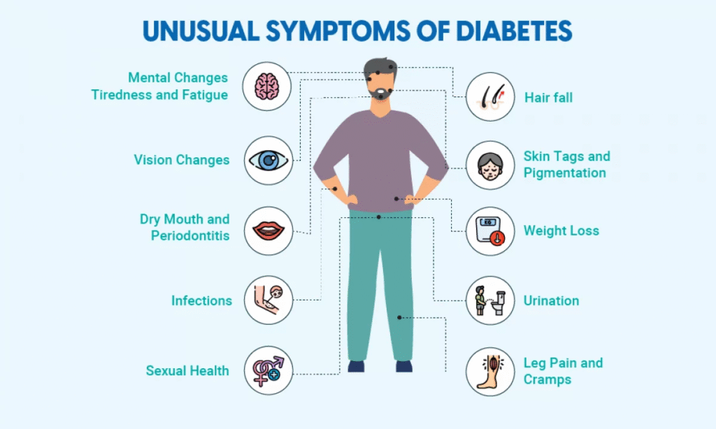 - Common symptoms: frequent urination, extreme thirst, fatigue, and sudden weight loss.