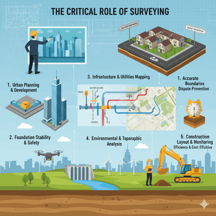 Surveying is not just about drawing maps or marking land boundaries; it is about shaping the future of our cities and environment. Some key reasons why surveying is important include: