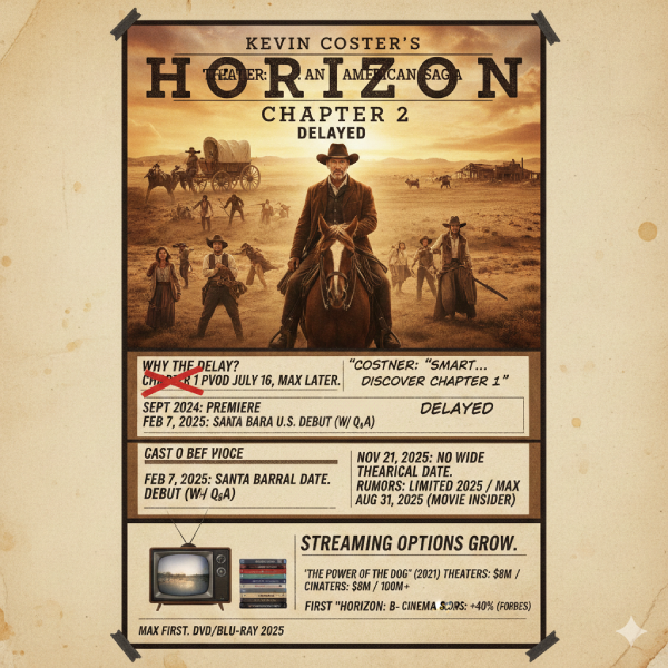 Excitement built for August 16, 2024. Then, poof, delay. Why was Horizon: An American Saga Chapter 2 delayed? Chapter 1’s $38M vs. $100 total cost (including marketing). Warner Bros. pulled it to let Chapter 1 stream on PVOD July 16, 2024, and on Max later.