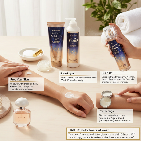 Layering turns good scents into great ones. For “how to make In the Stars last longer on skin,” follow this easy routine: