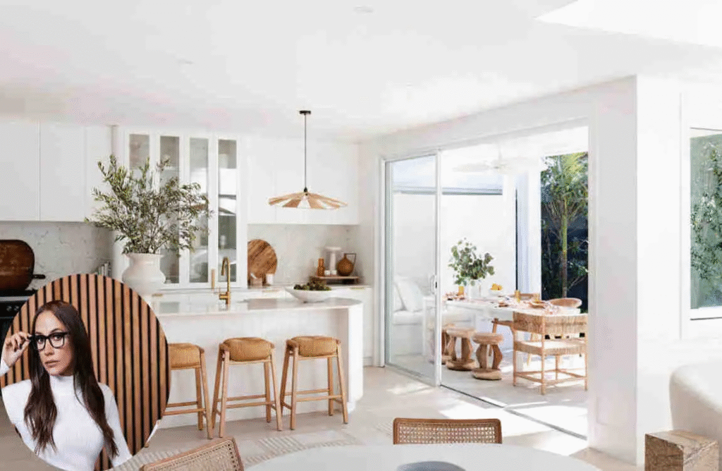 Her home interior features neutral tones with stylish vintage and modern décor elements.
