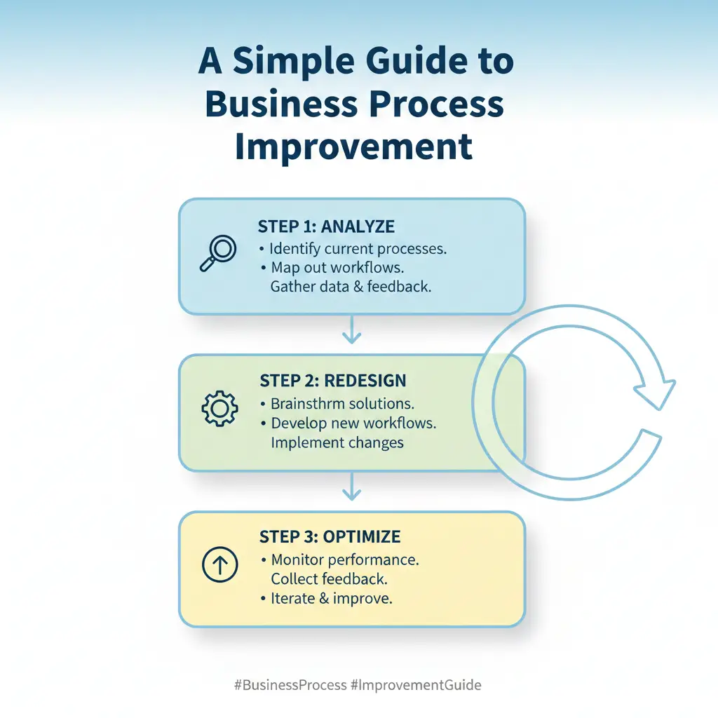 Here is the simple way to list the 3 main steps you see in the process. for making business processes better. These steps are: Identify, Document and Simplify, and Implement and Follow Through. They build on each other for real change.